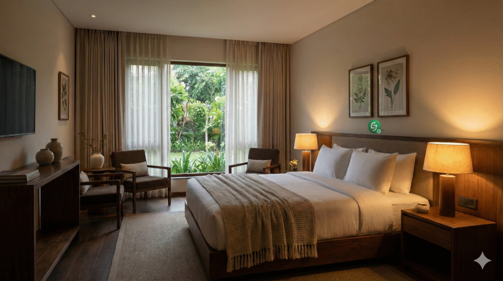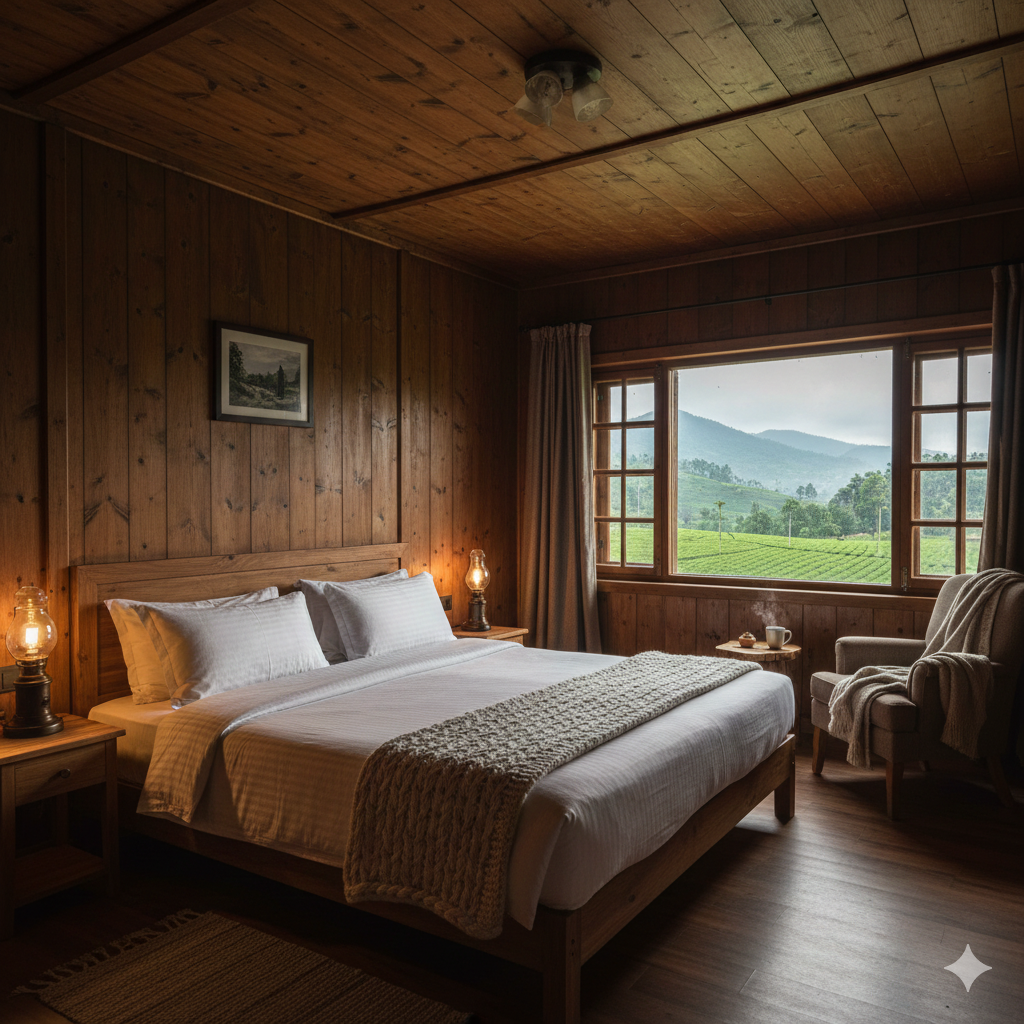 Enjoy premium bedding, warm interiors, 24/7 hot water, scenic balconies, and a peaceful environment surrounded by tea gardens and mountains.